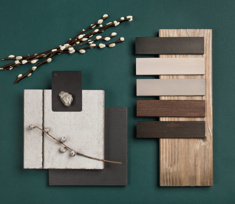 Den interiöra färgpaletten präglas av friska toner mot naturliga material. Mörkt oljade ekgolv och granitkeramikplattor på valda ytor. Lutande snedtak med balkar i ljust trä.